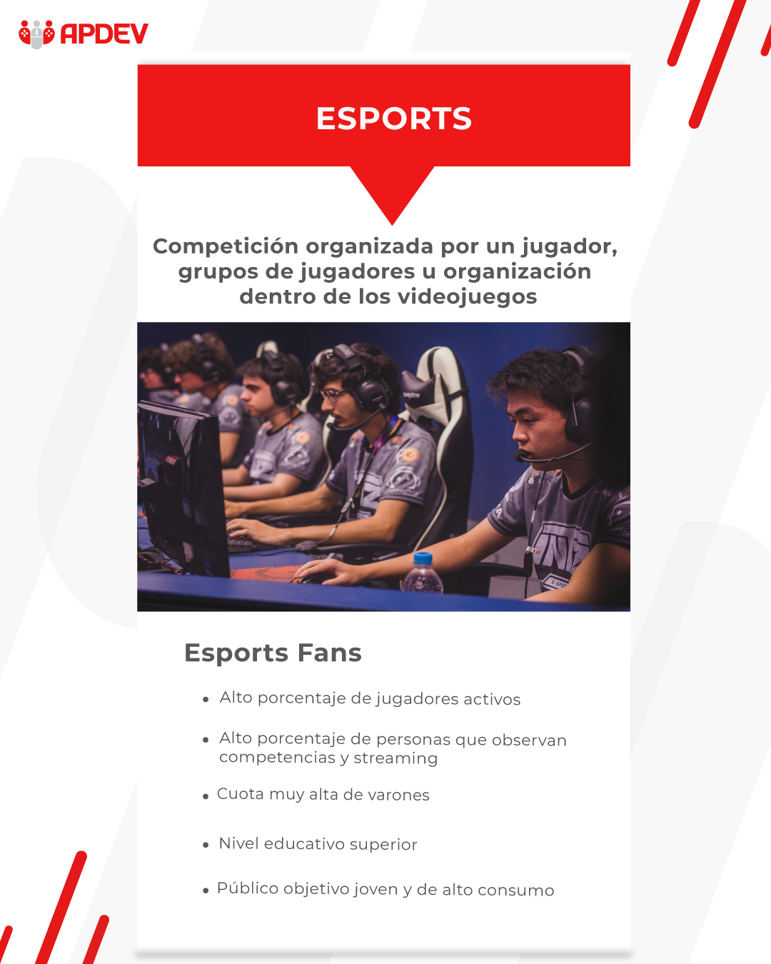 Los esports representan la evolución del gaming hacia el deporte de alto rendimiento. Aquí, jugar ya no es solo un hobby, es entrenamiento, estrategia, trabajo en equipo y búsqueda de patrocinios. Pero el fenómeno va más allá de los jugadores, los fans de los esports son consumidores voraces de contenido.