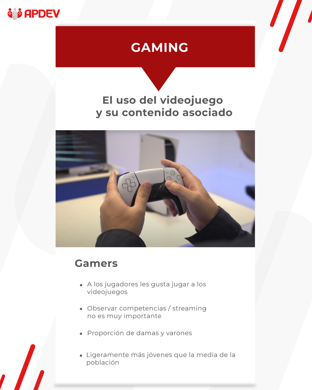 - Consumo de streaming: Secundario. Un gamer puede ver algún video de YouTube sobre trucos de un juego, pero no es un consumidor habitual de Twitch o torneos.