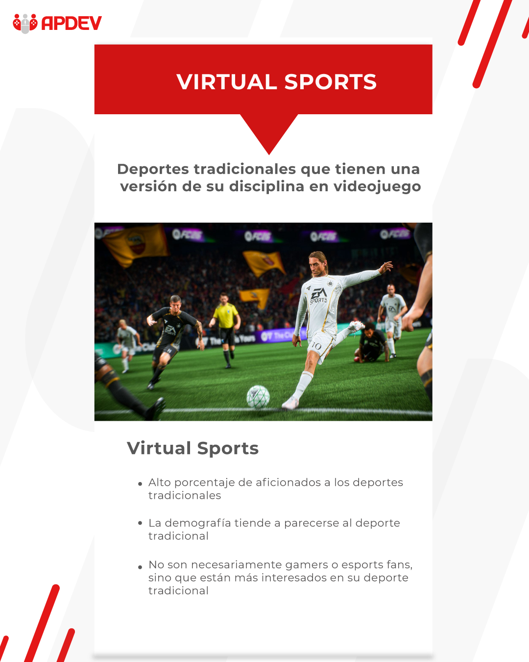 - Origen: Provienen del deporte tradicional, no necesariamente del gaming. Un hincha de la Liga 1 o la Champions League, puede jugar FIFA para "dirigir" a su equipo, aunque nunca haya jugado un RPG o un shooter.